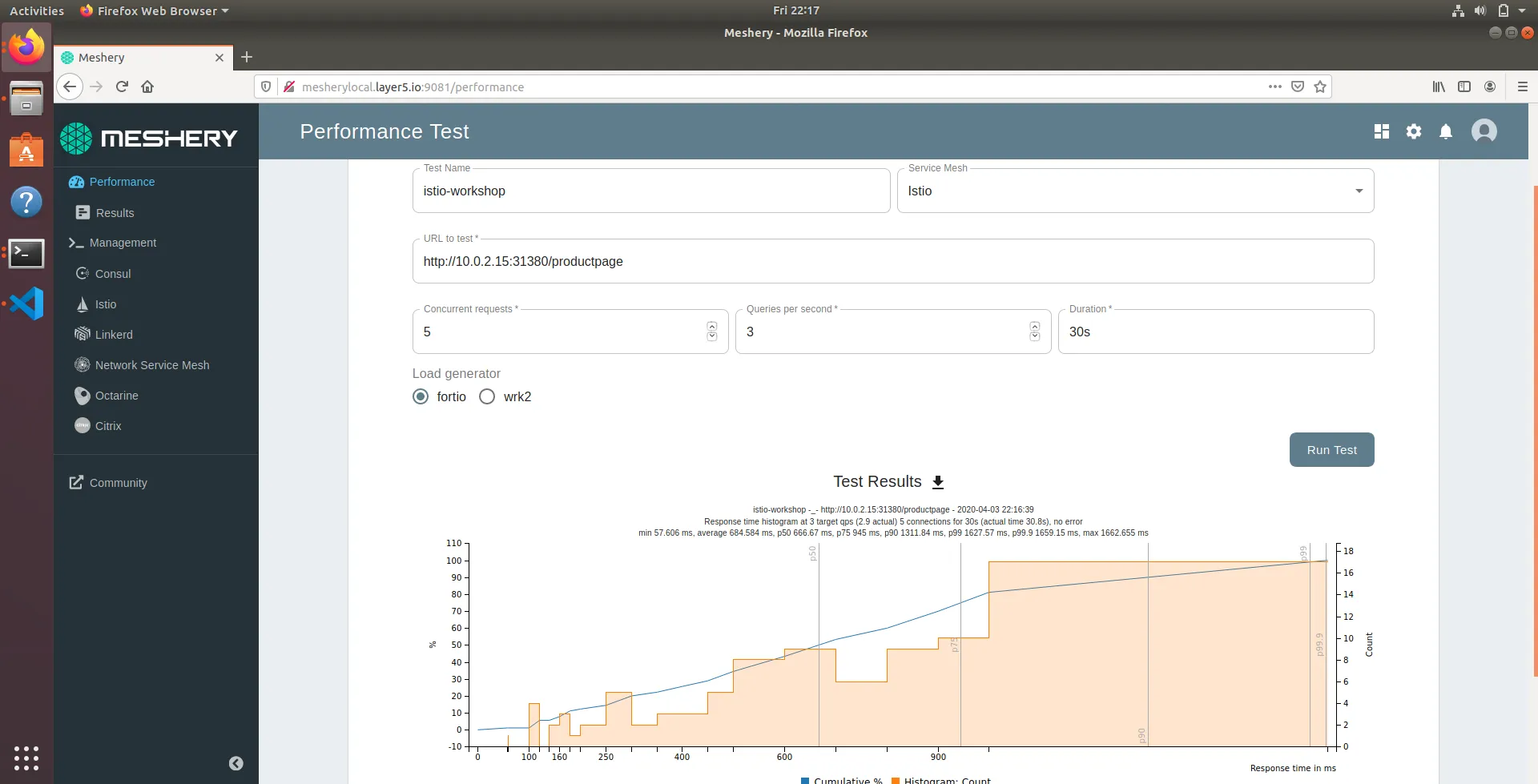 Let us now use Meshery to make several calls to product page app by changing the number of concurrent connections to 5 from within Meshery's Performance page.